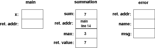 And finally, here they are just after main calls error; note that the string literals would be stored in the Static Data Area: