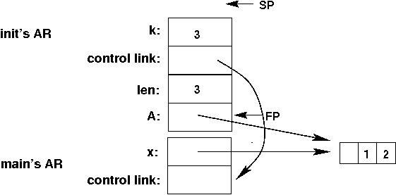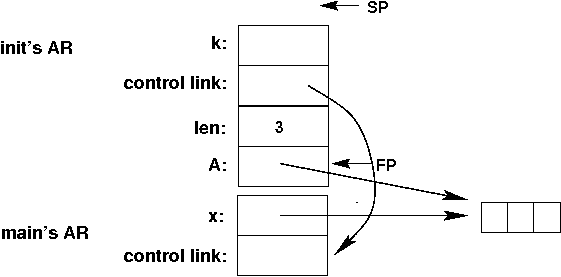 Here is the stack just after main calls init (the array pointed to by x and A is in the heap):